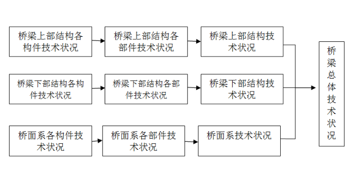 1、公路橋梁技術(shù)狀況評(píng)定包括橋梁構(gòu)件、部件、橋面系、上部結(jié)構(gòu)、下部結(jié)構(gòu)和全橋評(píng)定。公路橋梁技術(shù)評(píng)定采用分層綜合評(píng)定與五類橋梁?jiǎn)雾?xiàng)控制指標(biāo)相結(jié)合的方法,先對(duì)橋梁各構(gòu)件進(jìn)行評(píng)定,然后對(duì)橋梁各部件進(jìn)行評(píng)定,然后對(duì)橋梁各部件進(jìn)行評(píng)定,再對(duì)橋梁系、上部結(jié)構(gòu)和下部結(jié)構(gòu)進(jìn)行評(píng)定,最后進(jìn)行橋梁總體技術(shù)狀況的評(píng)定,評(píng)定指標(biāo)如下圖所示: