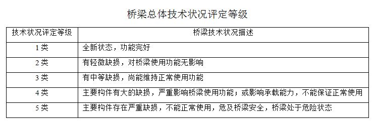 (2)橋梁總體技術(shù)狀況評(píng)定等級(jí)分為1類、2類、3類、4類、5類,見下表: