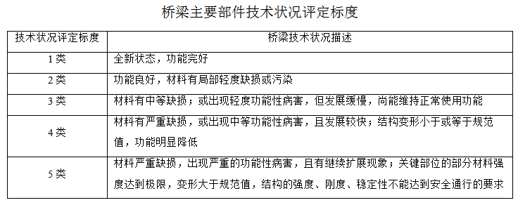 (3)橋梁主要部件技術(shù)狀況評(píng)定標(biāo)度分為1類、2類、3類、4類、5類,見下表: