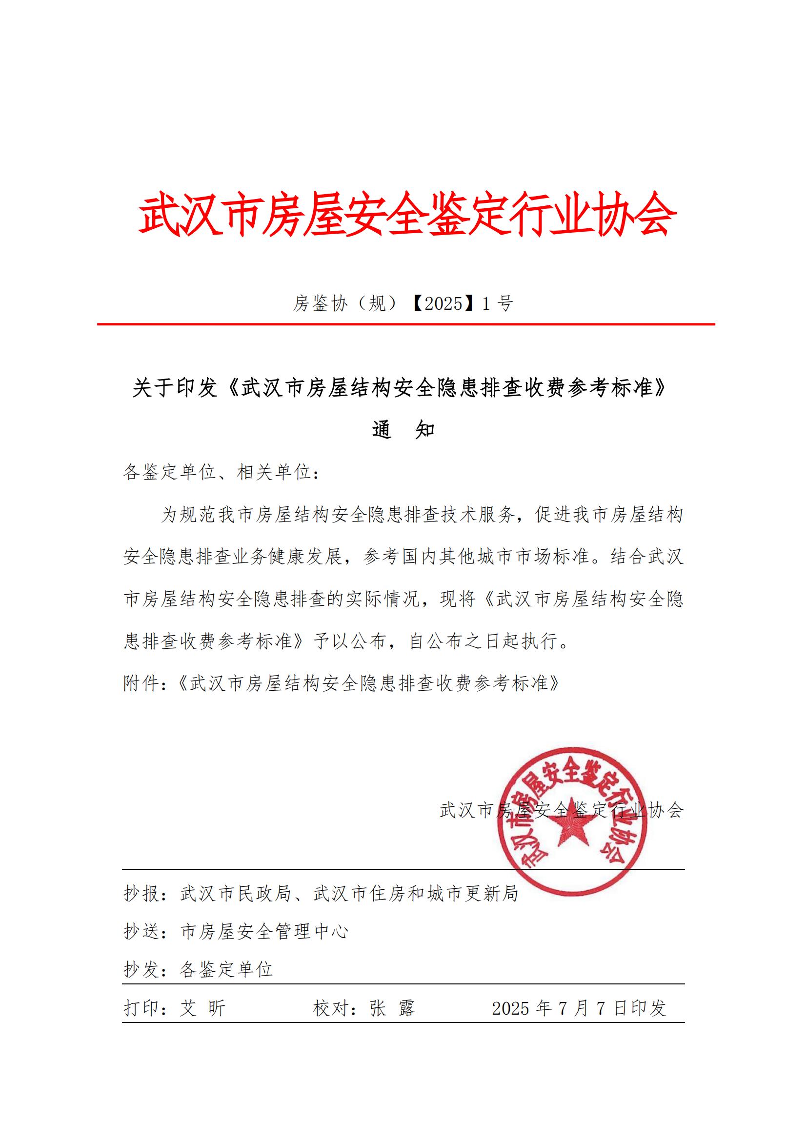 關(guān)于印發(fā)《武漢市房屋結(jié)構(gòu)安全隱患排查收費(fèi)參考標(biāo)準(zhǔn)》通 知
